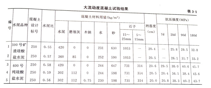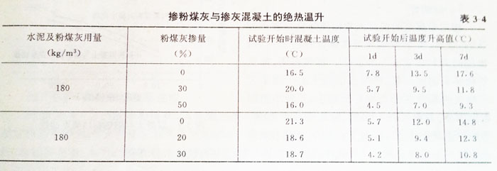 在大體積混凝土中,使用普通硅酸鹽水泥,由于水泥水化時硅酸三鈣(C3S)和鋁酸三鈣(C3A)作用發(fā)生熱量,Ig硅酸鹽水泥的總放熱量可達502J,因而導致混凝土溫度升高以至溫差收縮引起的裂縫。在普通混凝土中摻入粉煤灰后,水化熱明顯降低。表3—4是混凝土溫升狀況。由表列數(shù)據(jù)可知,摻30%粉煤灰與不摻粉煤灰的混凝土相比,絕熱溫升低27%~33%,較高溫升降低30%,并且可以減少或完全不需要人工冷卻措施。