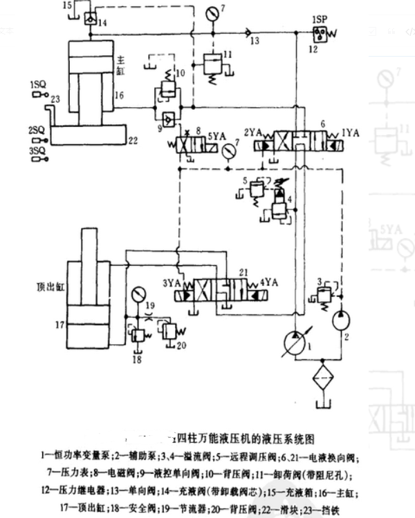 5、最后主缸停止時(shí)的狀態(tài) ,當(dāng)主缸滑塊上的鐵23按下沖程開關(guān)1SQ時(shí),電磁鐵2YA被切斷,主缸活塞被位于M功能中心的閥門6鎖定,停止運(yùn)動(dòng),返回行程結(jié)束。此時(shí),泵1油通過閥門6,閥門21返回油箱,泵處于卸載狀態(tài)。在實(shí)際使用中,主汽缸可以在任何時(shí)候停下來。